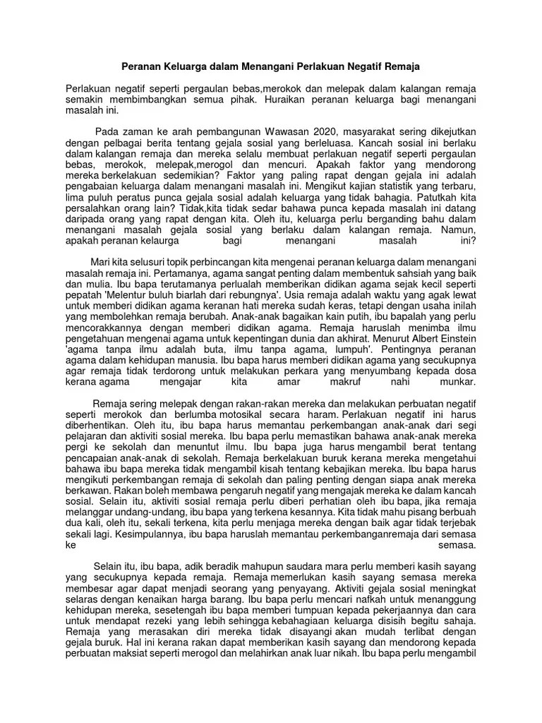 Related : Karangan Masalah Sosial Dalam Kalangan Remaja / Karangan Punca Punca Gejala Sosial Dalam / Peranan keluarga dalam menangani masalah ini juga ialah dari aspek penyediaan persekitaran yang harmonis..